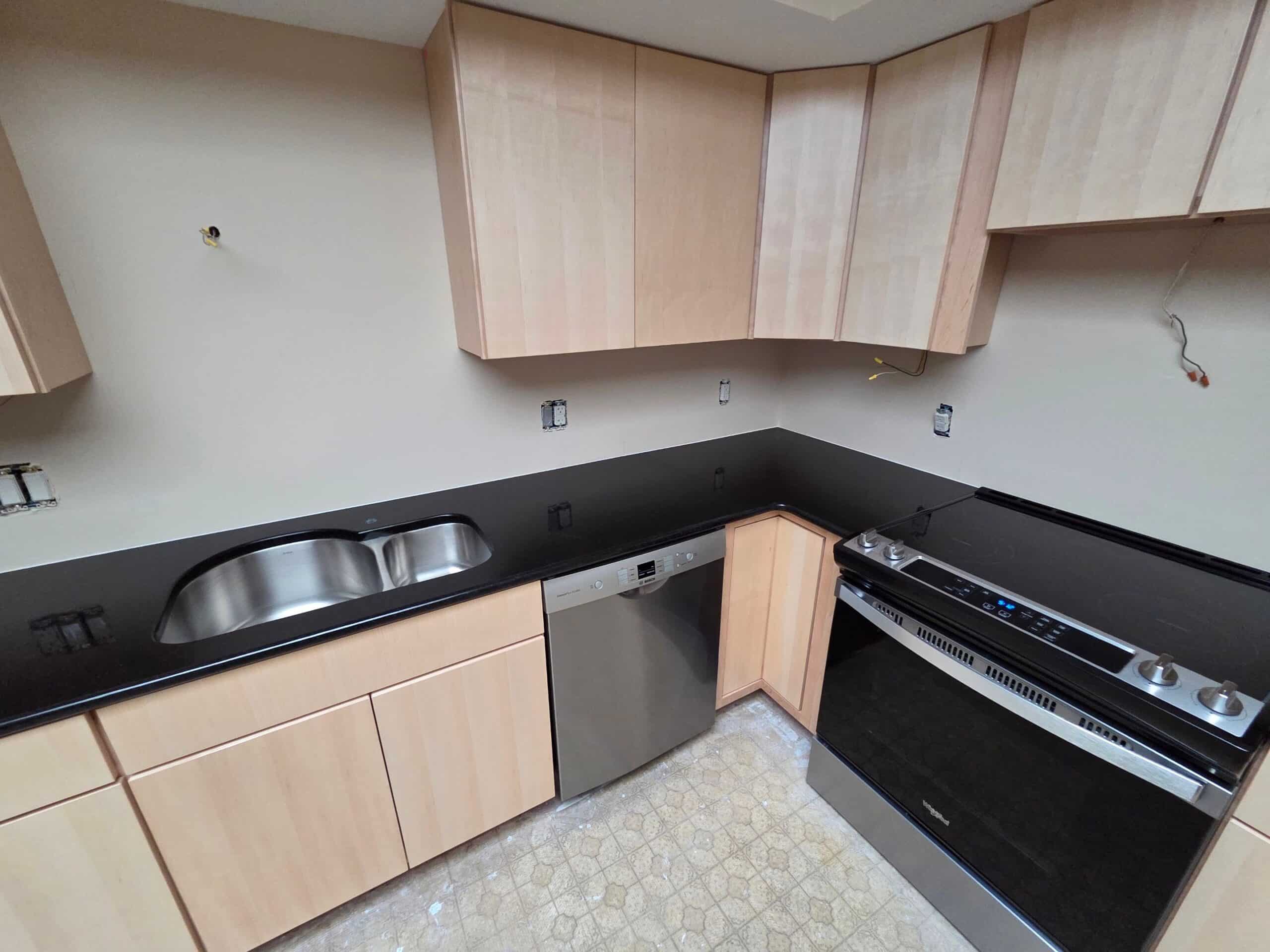 - Granite islands with quartz countertops on perimeter cabinets.